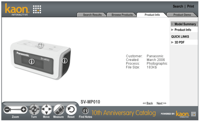 One of the cool things you can do with a 3D product model is attach feature and benefit information bubbles to physical features of the product. We’ve been doing this since we started doing 3D product marketing on the web, using a technique I called the “Hot Spot.” (I’ve spent years trying to replace that name with something less jargonny, but I’ve been unsuccessful.) In a browser, you hover your mouse over the 3D places and information pops up. On a touch screen, you touch the hot spot with your finger to see the information. In either case, we need to give the user a clue of where the information is hidden.